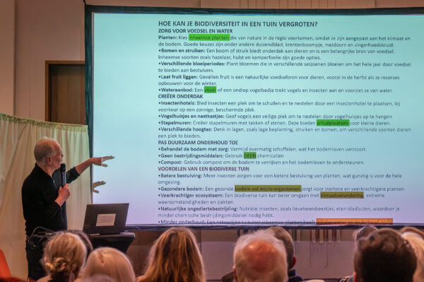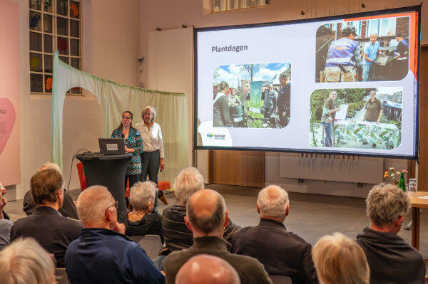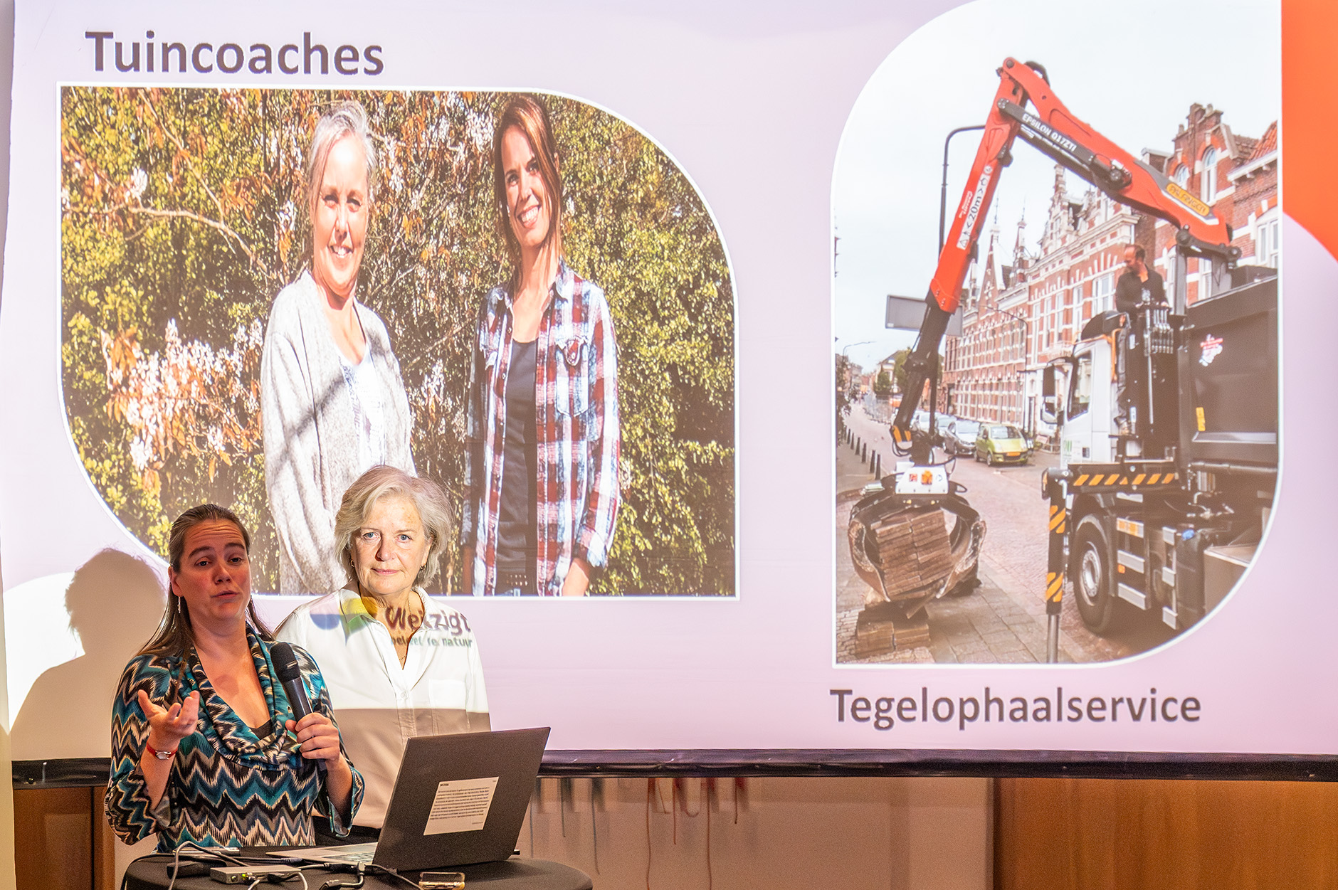 Leanne Stange stipt een aantal initiatieven aan; bijvoorbeeld de tegelophaalservice, de mogelijkheid om een tuincoach aan te vragen, sociaal tuinieren met een tuinmaatje of Biodivers Dordt. Veel inwoners maken inmiddels gebruik hiervan en laat het aantal geveltuintjes gestaag groeien. De gemeente legt hiervoor de randen aan en levert geschikte aarde; de bewoners planten zelf het groen en onderhouden het. Op veel plekken in de stad zijn inmiddels overtuigende voorbeelden te zien. Blijkbaar was er behoefte aan een avond als deze, want de Kunstkerk was goed gevuld. Hopelijk zorgt dit voor nog meer geïnspireerde inwoners die hiermee aan de slag gaan!